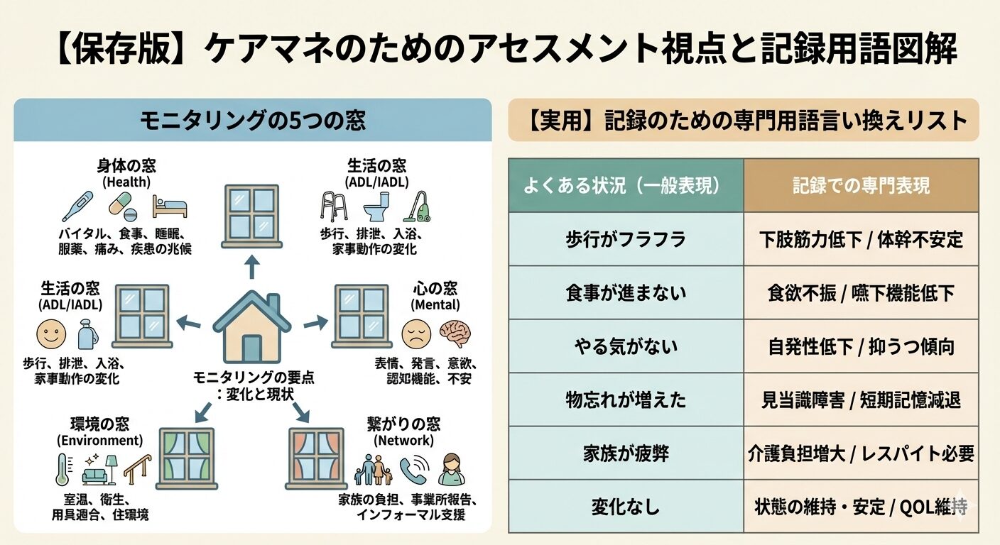 ブログに掲載する際の「図解イメージ」として構成しました。以下の5つの窓(視点)を意識すると、アセスメントの漏れがなくなります。